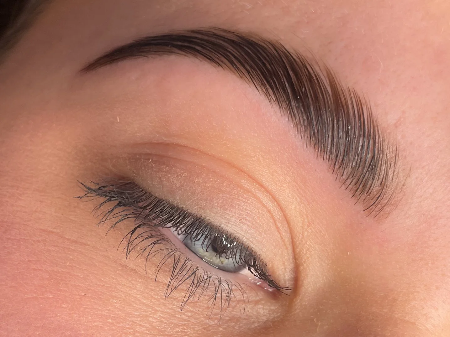 Brow lamination is the process of perming the eyebrow hairs in an upward and curved pattern to enhance the texture and overall fullness of the brow. This process lasts on the brow hairs 4-6 weeks depending on the hair cycle. This process can be done with or without a tint for an added enhancement. Brow laminations can be styled for full fluffy brows or sleek and curved depending ond the clients preference.